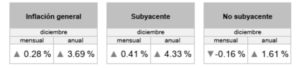En diciembre de 2025, el Índice Nacional de Precios al Consumidor (INPC) fue de 143.042, un incremento del 0.28 % respecto al mes anterior. Este resultado ubicó la inflación general anual en 3.69%, por arriba, pero dentro del rango estimado de 3 +/-1%. La inflación subyacente, en la cual incide la política monetaria con efecto rezagado, fue de 4.33% anual, por encima del rango de variabilidad del Banco de México de 3 +/- 1%, debido a que índice de precios subyacente, que excluye bienes y servicios con precios más volátiles, o que no responden a condiciones de mercado, incrementó 0.41% a tasa mensual. A su interior, los precios de las mercancías subieron 0.33% y los de servicios, 0.48 por ciento.