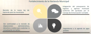 En materia de fortalecimiento de la Hacienda Municipal, en la que interviene el secretario de Fianzas, se abordará la revisión de la nueva Ley de Hacienda para los municipios; la integración del presupuesto de ingresos y egresos municipales conforme al Clasificador por Rubro de Ingresos (CRI), aprobado por el Consejo de Armonización Contable; y el seguimiento a la revisión de disposiciones administrativas, derechos y costeo para sustentar la actualización de tarifas; así como el seguimiento de la agenda de agua potable, con el titular de la Secretaría de Agua y Medio Ambiente.