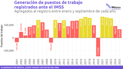 Aunque al cierre del tercer trimestre del año, se registraron 107 mil 501 nuevos empleos en julio, 21 mil 750 en agosto y 116 mil 765 en septiembre, en el acumulado de enero-septiembre, apenas llegaron a 333 mil 303, el 37% de una meta de 900 mil para ir incorporando a los mexicanos que mes a mes se suman al sector económicamente activo. En general, al 30 de septiembre de 2025, el Instituto Mexicano del Seguro Social (IMSS), reportó 22 millones 571 mil 682 puestos de trabajo registrados.