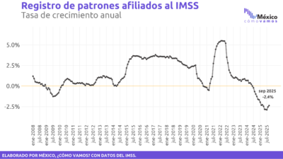 En cuanto a la Meta 3 del Plan México, de generar 1.5 millones de empleos adicionales en manufactura y sectores estratégicos, a nueve meses del anuncio, se han perdido (-)20 mil 729 puestos de trabajo registrados ante el IMSS en las industrias de la transformación, fenómeno no observado en las crisis de 2008-2009 y 2020. Los patrones afiliados al IMSS también registraron una contracción de (-)2.4% anual en septiembre, mayor a la registrada en 2009 y 2020.