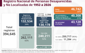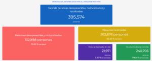 De las personas localizadas, contrasta la cifra de 21 mil 971 encontradas con vida, contra las 240 mil 705 halladas sin vida, así como las 132 mil 898 aún no localizadas.