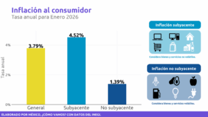 La inflación general en enero de 2026 fue de 3.79%, superior al 3.59% de enero de 2025 y al 3.69% de diciembre pasado. La cuesta de enero se reflejó en los precios de las mercancías y servicios. Aunque puede decirse que la inflación general anual se mantiene, por séptimo mes consecutivo, dentro del rango estimado por el Banco de México, de 3.00% (+/- 1%). Preocupa la inflación subyacente, que incide en la política monetaria del Banco de México, de 4.52%, mayor a la del mes anterior de 4.33% y la más alta desde marzo de 2024. El semáforo de la Inflación del observatorio de “México, ¿cómo vamos?” se encuentra en amarillo.