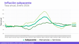 Dentro de la inflación subyacente, las mercancías mostraron una aceleración a la alza, al pasar de 4.30% en diciembre de 2025 a 4.56% en enero de 2026. De las mercancías, las que tuvieron incrementos más altos, son: alimentos, bebidas y tabaco, con una tasa de 6.13% anual. Los precios de los servicios se incrementaron 4.48%, en su comparación anual. De los servicios, los educativos mostraron el mayor incremento, con un 6.02% anual.