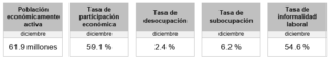 Con una población económicamente activa (PEA) de 61.9 millones de personas de 15 años y más, superior en 1.1 millones respecto a 2024, la Encuesta Nacional de Ocupación y Empleo (ENOE) del Instituto Nacional de Estadística y Geografía (INEGI), reporta una tasa de participación económica del 59.1%, a diciembre de 2025, menor a la de diciembre de 2024, que fue de 59.3%, es decir 152 mil personas menos en relación a noviembre de 2024. En cuanto a la informalidad laboral, la tasa se ubicó en 54.6%, superior al 53.7% de 2024. La población total ocupada alcanzó los 60.4 millones de personas, el 97.6% de la PEA. La tasa de desocupación se situó en 2.4%, igual a la de 2024.