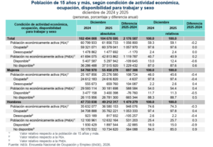 En diciembre de 2025, la población desocupada fue de 1.5 millones de personas, cantidad similar a la de un año antes: la de mujeres se ubicó en 660 mil, aumentó en 104 mil respecto a diciembre del año anterior; la de hombres se situó en 818 mil, descendió en 105 mil frente al último mes de 2024.