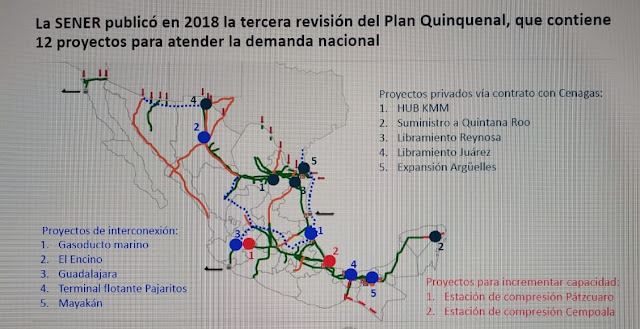 Un informe de la Subsecretaría de Hidrocarburos de la Secretaría de Energía, de 2018 (es el último que se tiene), reporta los planes quinquenales sobre el mercado del gas natural y las obras de infraestructura requeridas para garantizar el abasto en el país, frente a una demanda creciente. De los 12 proyectos en proceso, en ese tiempo, destacan el gasoducto marino, para transportar gas natural del sur de Texas a Tuxpan, Ver.; la reconfiguración de la estación de comprensión de Cempoala, para atender la demanda del sur del país, y la Terminal flotante de Pajaritos, alternativa que diversifica las importaciones y atendería la demanda del sureste en menor tiempo. También, la Sener diseñó una Política de Almacenamiento de gas natural con dos componentes: Almacenamiento e Información. El almacenamiento debía realizarse en un yacimiento económicamente inviable para la extracción. El Centro Nacional de Control de Gas Natural (CENAGAS) inició el proceso de licitación y se quedó en el segundo paso, restándole otros dos, de los cuales ya no hay información, porque este fue el último análisis de seguimiento que se presentó o que se hizo público. Además, a partir de octubre de 2018, en cuanto a Información, todos los procesadores de gas, transportistas, almacenistas y gestores tenían la obligación de reportar semanalmente los movimientos y en casos de emergencia tendrían que hacerlo diario.
