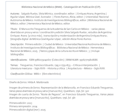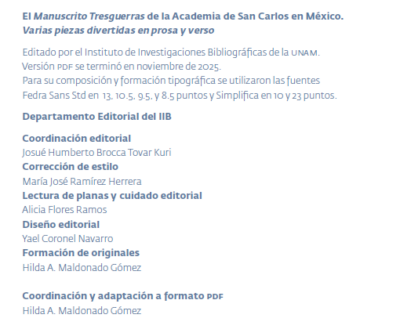 La Universidad Nacional Autónoma de México, a través del Instituto de Investigaciones Bibliográficas, publicó recientemente el Manuscrito Tresguerras de la Academia de San Carlos en México, que incluye varias piezas divertidas en prosa y verso, después de haber sido sometida la obra a un proceso de dictamen, en la modalidad doble ciego, por académicos especialistas en el tema. Los dictámenes resultaron favorables para la totalidad de la obra, en todas sus secciones, partes y capítulos. En base a ello, el Comité Editorial del Instituto de Investigaciones Bibliográficas dio el visto bueno para su publicación. De acuerdo a este proceso, la UAM distribuye el documento bajo una Licencia Creative Commons Atribución-NoComercial-SinDerivadas 4.0 Internacional, a través de este acceso en línea: https://libros.iib.unam.mx/index.php/li/catalog/book/235