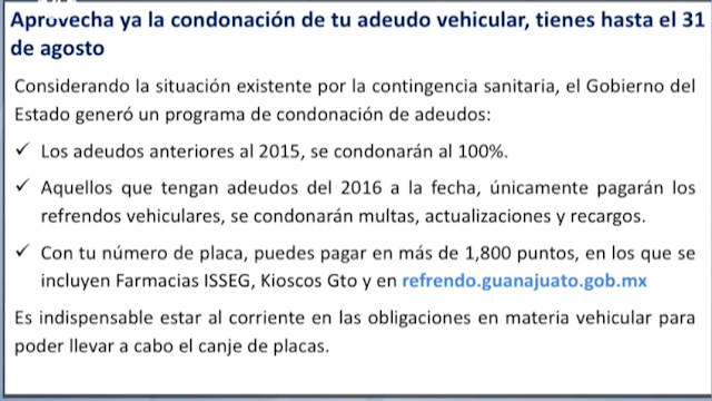 Así los expresaron Edmundo Alaín Soto Torres, subsecretario de Finanzas e Inversión, y Sergio Daniel Espinosa, director general de Ingresos, ambas dependencias de la Secretaría de Finanzas, Inversión y Administración del Gobierno del Estado de Guanajuato, quienes anunciaron también un programa de condonaciones de derechos multas y recargos para ponerse al corriente antes del arranque del canje, es decir de hoy al 31 de agosto.