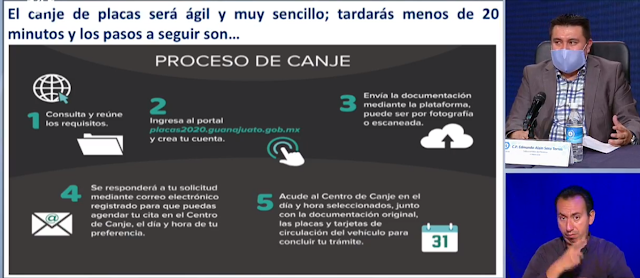 Una vez llegado el momento para realizar el canje de placas hay que solicitar una cita en la página de internet: https://placas2020.guanajuato.gob.mx, donde además encontrará la información general del proceso, los requisitos, el proceso y el protocolo a seguir por el COVID-19.
