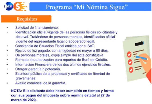En la conferencia de prensa, que estuvo presidida por Mauricio Usabiaga Díaz Barriga, secretario de Desarrollo Económico Sustentable, y por Héctor Salgado Banda, secretario de Finanzas, Inversión y Administración, del gobierno del estado, se dejó en claro que estos nuevos créditos, que van de 500 mil pesos a dos millones de pesos, vienen a una tasa anual del 5%, con posibilidades de reembolso de los intereses al término de los 36 meses de plazo, que corren a partir de octavo mes de haber recibido el préstamo, pues tienen siete meses de gracia, realmente son accesibles -dijo-, aunque con más requisitos.
