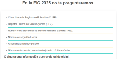 En el comunicado oficial, el instituto garantiza que los datos de todas las personas son confidenciales: “al término de la entrevista, la información se encripta automáticamente”. Aclara que los entrevistadores NO PREGUNTARÁN datos datos personales, como: Clave Única de Población (CURP), ni el Registro Federal de Causantes (RFC), ni Número de la cédula del Instituto Nacional Electoral (INE), ni número de seguridad Social; menos afiliación política, ni número de cuenta bancaria.