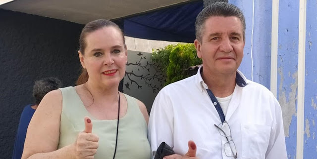 Javier Mendoza Márquez y su esposa Rosa María Suárez, junto con el dirigente municipal del PAN, se proclaman ganadores de la elección en Celaya.