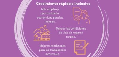 -Impulsar un crecimiento económico más acelerado, pero sobre todo inclusivo, que reduzca las brechas de participación laboral y la productividad entre diversos grupos de trabajadores, especialmente el de las mujeres. Mejorar las oportunidades económicas y de calidad de vida en los hogares de las zonas rurales, particularmente los dedicados a las actividades agrícolas y fomentar mejores condiciones de productividad y protección social para los trabajadores del sector informal.