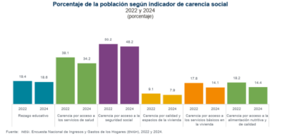 En cuanto a estadísticas de pobreza, al cierre de 2024, el Instituto Nacional de Estadística (INEGI), indica que el 29.6% de la población del país se encontraba en pobreza multidimensional, porcentaje que, comparado con el 2022, representó una disminución del 6.8 puntos porcentuales; en tanto que, el 5.3% se reportó en situación de pobreza extrema, que contra el 2022 representó una disminución de 9.1 a 7.0 millones de personas.