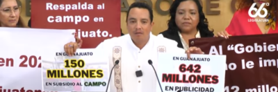 En contraparte, el grupo parlamentario del Partido morena presentó el punto de acuerdo, de obvia resolución, para exhortar a la gobernadora Libia Dennise García Muñoz Ledo, para que, en el ámbito de sus atribuciones, reestructure el presupuesto estatal, para priorizar el apoyo al campo guanajuatense a cuenta del gasto en publicidad, con la finalidad de contribuir a generar bienestar a los productores, así como seguridad y soberanía alimentaria, de acuerdo al planteamiento inicial del diputado Carlos Abraham Sotomayor.