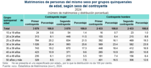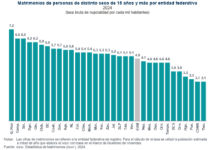 De acuerdo con la Estadística de Matrimonios (EMAT), en 2024, el número de matrimonios registrados fue de 486 mil 645: el 98.7% fue de contrayentes de distinto sexo y 1.3%, del mismo. De los matrimonios entre personas de distinto sexo, 26.9% de las mujeres y 18.4 % de los hombres se casó antes de los 25 años. De los matrimonios del mismo sexo, el de mujeres fue mayor al de hombres, los cuales ocurrieron entre los 30 a 34 años de edad.