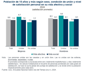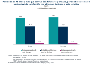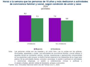 En cuanto al uso del tiempo, la Encuesta Nacional de Uso del Tiempo (ENUT) de 2024, muestra que las mujeres unidas, de 15 años y más, destinaron en promedio, 8.2 horas semanales a actividades de convivencia familiar y social, frente a las 7.4 horas de las mujeres no unidas, pero mayor al que los hombres dedicaron a estas actividades, independientemente de condición de unión.