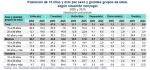 Sobre la situación conyugal, en 2025 se registró un mayor porcentaje de mujeres casadas y en unión libre, en comparación con los hombres, con diferencias de 3.6 puntos y 5.0 puntos porcentuales, respectivamente. Para la población adulta mayor, de 60 años y más, el porcentaje de mujeres viudas fue de 32.8 %, superior al 12.5% de los hombres viudos.
