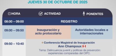 En el acto inaugural, se impartirá una conferencia magistral a cargo de Ann Champoux, directora general del Centro Internacional para la Prevención de la Criminalidad (CIPC) de Canadá. Participarán también ponentes y especialistas de talla mundial provenientes de Argentina, Brasil, Guatemala, Colombia, Bolivia, Chile, Estados Unidos y México, junto a académicos, funcionarios y expertos en la materia.
