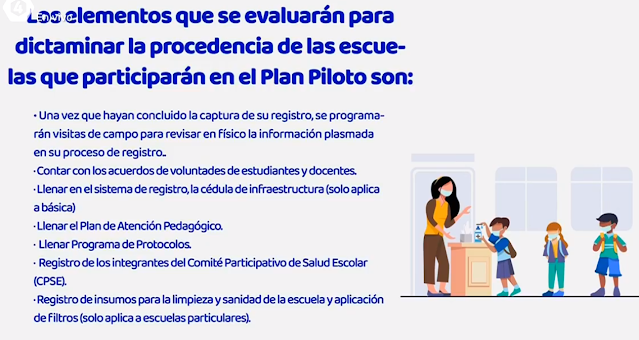Para el regreso a clases en esta nueva etapa del pilotaje, a partir del lunes 3 de mayo se va a analizar el cumplimiento de los documentos solicitados, así como las condiciones de las instalaciones; las que no cumplan todos los requisitos, no se van a descartar, pero se irán entrando de manera escalonada. De hecho el martes 11 de mayo serán pocas las que empiecen; las demás se irán incorporando los días 17, 24 y 31 de mayo, para poder acompañar y evaluar el cumplimiento de las medidas sanitarias e higiene personal, así como la sana distancia y el uso del cubrebocas, que será obligatorio.