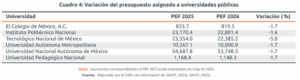 De acuerdo a la distribución del presupuesto educativo para 2026: al nivel de educación básica le incrementaron el 6.1%; mientras a la educación media superior y superior -UNAM, IPN y UAM- les recortaron el 2.7% y el 3.4%, respectivamente. Este recorte, en el nivel superior impactará en la capacidad para operar e investigar.