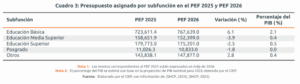 Un análisis completo sobre el Presupuesto de Egresos de la Federación 2026, elaborado por el Centro de Investigación Económica y Presupuestaria (CIEP), reconoce que el presupuesto destinado a educación en México tuvo un incremento real del 3.0%, en relación al asignado en 2025, alcanzando la cifra de 1.2 billones de pesos, que a su vez representa el 10.7% del presupuesto total y el 3.4% del producto interno bruto (PIB), por debajo del 4.0% o 6.0% del PIB recomendado internacionalmente para sostener sistemas educativos robustos, incluyentes y sostenibles en el mediano y largo plazo.