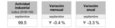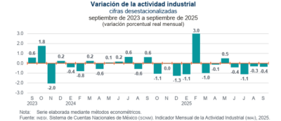 Comparando septiembre de 2025 contra septiembre de 2024, todas estas actividades disminuyeron: la Construcción descendió 7.2%; Minería, 3.2%; las Industrias manufactureras, 2.3%; y Generación, transmisión, distribución y comercialización de energía eléctrica, suministro de agua y de gas natural por ductos al consumidor final, 0.2%, lo que ubica el crecimiento de la economía lejos del pronóstico del gobierno federal de 2.0% y 3.0%, mientras otras instituciones esperaban un comportamiento más moderado, pero positivo, del 0.7% y del 1.7%, previendo una desaceleración de la economía.