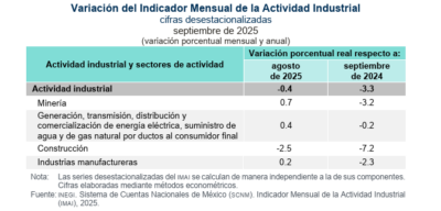 De acuerdo al reporte del Indicador Mensual de la Actividad Industrial (IMAI) de septiembre de 2025, con cifras desestacionalizadas, publicado este martes 11 de noviembre, en su variación mensual, la Construcción disminuyó 2.5%, mientras las Industrias Manufactureras crecieron 0.2 %; la Generación, transmisión, distribución y comercialización de energía eléctrica, suministro de agua y de gas natural por ductos al consumidor final, 0.4%; y Minería, 0.7 por ciento.