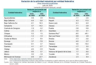 En el reporte de la actividad industrial por entidad federativa correspondiente a julio, Guanajuato registra una disminución del 0.1% en comparación al mes anterior y un crecimiento del 3.7% en comparación de julio de 2024, aunque la Secretaría de Economía de Guanajuato informa de un crecimiento del 4.6% en el acumulado de enero a julio.