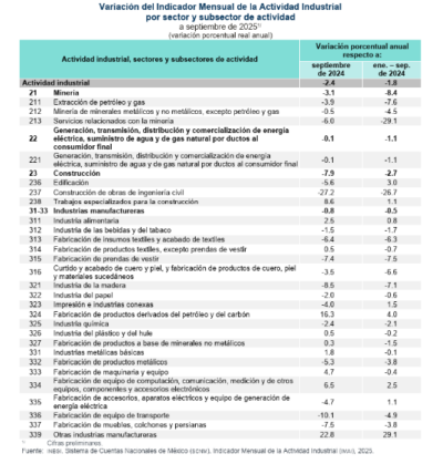 Comparando septiembre de 2025 contra septiembre de 2024, todas estas actividades disminuyeron: la Construcción descendió 7.2%; Minería, 3.2%; las Industrias manufactureras, 2.3%; y Generación, transmisión, distribución y comercialización de energía eléctrica, suministro de agua y de gas natural por ductos al consumidor final, 0.2%, lo que ubica el crecimiento de la economía lejos del pronóstico del gobierno federal de 2.0% y 3.0%, mientras otras instituciones esperaban un comportamiento más moderado, pero positivo, del 0.7% y del 1.7%, previendo una desaceleración de la economía.