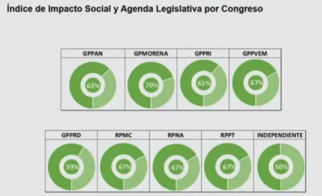 Esta evaluación se realizó en base a tres índices: Eficiencia y Transparencia Legislativa, Eficiencia Presupuestal y Fiscalización y de Impacto Social y Agenda Legislativa, alcanzando porcentajes de eficiencia del 63%, 94% y 96%, respectivamente.