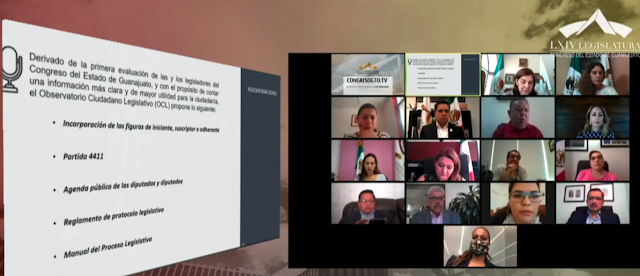 Guanajuato, Gto. (19 de octubre de 2020).- Como resultado del primer ejercicio de evaluación del trabajo del Congreso del Estado, el Observatorio Ciudadano Legislativo 2020 propuso para un segundo ejercicio incluir una evaluación cualitativa, y no sólo cuantitativa, para medir la eficiencia, así como mayor transparencia en la partida 4411, que destinan los diputados a diversos apoyos, entre otras áreas de oportunidad para mejorar en la transparencia y rendición de cuentas.