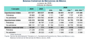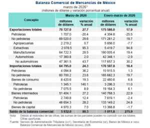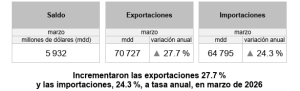 Las exportaciones de México, en marzo de 2026, alcanzaron un monto de 70 mil 727 millones de dólares, un 27.7% a tasa anual; contra 64 mil 795 millones de dólares en importaciones, un 24.3 más que en 2025, dando como resultado un superávit de 5,932 millones de dólares, superando el déficit de febrero por 463 millones de dólares. En el primer trimestre del año enero-marzo, las exportaciones representaron 175 mil 586 millones de dólares, contra 176 mil 597.8 millones de dólares de importaciones, con una balanza en contra por 1,011 millones de dólares. La contribución de Guanajuato está marcada por su potencial exportador en el ramo de las manufacturas y sector automotriz, que representan el 96.5% de sus exportaciones, de acuerdo al cierre de 2025 y apertura de 2026, ya que las cifras de marzo por entidad federativa, aún están en proceso.