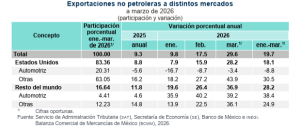 Las exportaciones no petroleras a Estados Unidos aumentaron 28.2% en marzo de 2026, y 36.9% en el resto de los países a los que México vende sus mercancías.