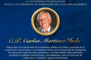 Este miércoles 29 de abril de 2026, el Laboratorio de Fiscal del Campus Celaya-Salvatierra, de la Universidad de Guanajuato, será nombrado oficialmente Laboratorio de Fiscal Claustro C.P. Carlos Martínez Inda, en reconocimiento a su trayectoria y fundador de la primera Escuela Profesional de Contabilidad en Celaya, junto con otros docentes y estudiantes de la entonces carrera comercial de contador privado de la Preparatoria Oficial.