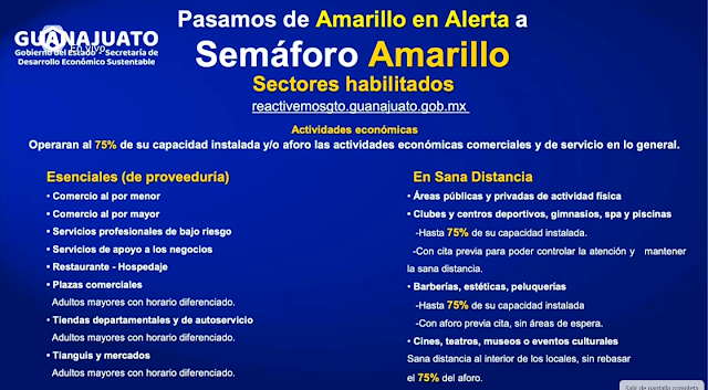 Así lo expresaron el secretario de Salud de Guanajuato, Daniel Alberto Díaz Martínez, y el Subsecretario de Desarrollo Económico, Froylán Salas Navarro, al presentar el reporte de COVID-19, casi al cierre de abril, y las nuevas condiciones del Semáforo Amarillo, que entrará a operar a partir de la semana del lunes 3 al 9 de mayo.