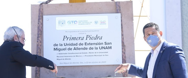 Aunque ya se había anunciado previamente, este jueves se puso la primera piedra del plan maestro de la Unidad de Extensión educativa de la Universidad Autónoma de México (UNAM) en San Miguel Allende, donde se van a invertir 40 millones de pesos, en su primera etapa, que contará con 13 aulas, aula de cómputo, Policlínica con laboratorios de atención a la población en las áreas de Fisioterapia, Odontología, Optometría y Adicciones. La capacidad total del plantel, al concluir esta etapa, será de 800 estudiantes.
