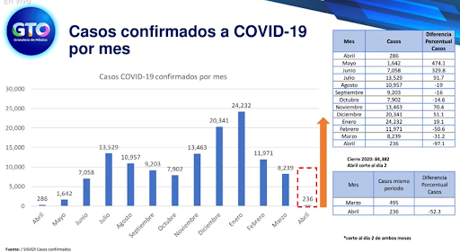 Guanajuato, Gto. (2 de Abril de 2021).- Aunque marzo cerró con 8,239 nuevos casos de coronavirus, contra los 11,971 de febrero y los 24,232 de enero, preocupa al sector salud de Guanajuato la movilidad registrada en este período vacacional, pues la cifra más alta de contagios, que fue la de enero pasado, se registró después de las vacaciones de diciembre.