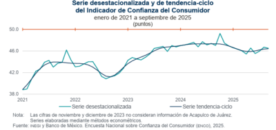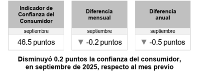 El Índice de Confianza del Consumidor a septiembre de 2025, con datos ajustados por estacionalidad, se ubicó en 46.5 puntos, generando una reducción mensual de 0.2 puntos y de 0.5 puntos en su comparación anual, de acuerdo al reporte del Instituto Nacional de Estadística y Geografía (INEGI) y el Banco de México, publicados este lunes 6 de octubre de 2025.