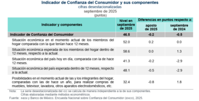 El Índice de Confianza del Consumidor a septiembre de 2025, con datos ajustados por estacionalidad, se ubicó en 46.5 puntos, generando una reducción mensual de 0.2 puntos y de 0.5 puntos en su comparación anual, de acuerdo al reporte del Instituto Nacional de Estadística y Geografía (INEGI) y el Banco de México, publicados este lunes 6 de octubre de 2025.