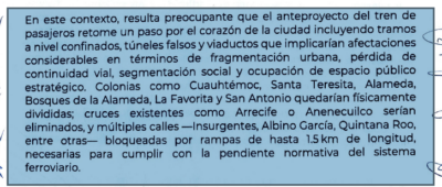 Tales consideraciones ponen el marco de fondo a las preocupaciones, dudas e inquietudes surgidas respecto a las condiciones de ejecución del proyecto, en un contexto urbano, técnico y social, que busca no sólo la viabilidad estructural de la obra, sino su plena compatibilidad con los procesos de planeación urbana sostenible y equitativa, además de las soluciones a las implicaciones urbanas, de movilidad, de conectividad y de reubicación de la infraestructura de redes de servicios, que implicará un costo elevado, no previsto, por ninguna empresa o dependencia.