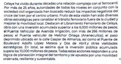 Sin embargo, tratándose de infraestructura de alto impacto territorial, preocupan las condiciones de ejecución en relación al contexto urbano, técnico y social del municipio, ya que hasta el momento no se cuenta con la información y socialización necesaria del proyecto, dada la situación compleja que ha vivido Celaya con el ferrocarril por más de 25 años, durante los cuales los gobiernos y la sociedad han buscado reducir los impacto negativos del cruce del tren por el centro urbano. De esa visión surgieron proyectos estratégicos para sacar las vías fuera de la ciudad y mejorar la movilidad local. La inversión en estas obras ha representado más de 10 mil millones de pesos.