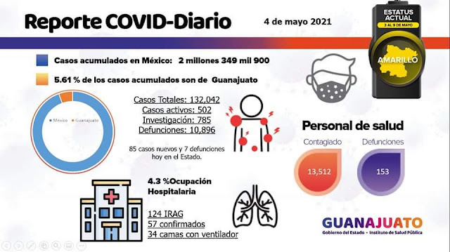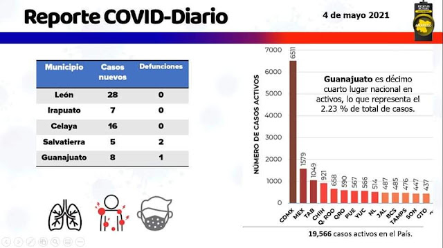 Con respecto al control de la pandemia, el secretario de Salud de Guanajuato, Daniel Alberto Díaz Martínez, informó que este martes se reportaron 64 nuevos casos de contagios y tres defunciones, lo que quiere decir que la pandemia no está controlada aún. Guanajuato ocupa el 14avo lugar nacional de casos activos, con 502; lo que representa el 2.23% de los 19 mil 566 existentes en todo el país.